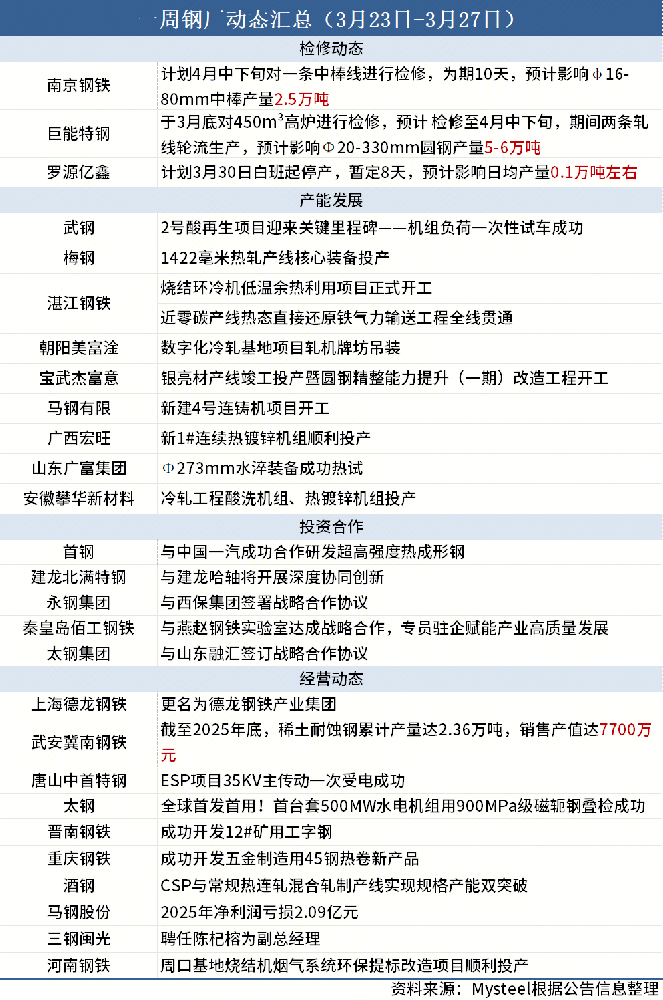 據(jù)Mysteel不完全統(tǒng)計,本周(3月23日-3月27日)3家鋼廠發(fā)布檢修信息,具體如下: