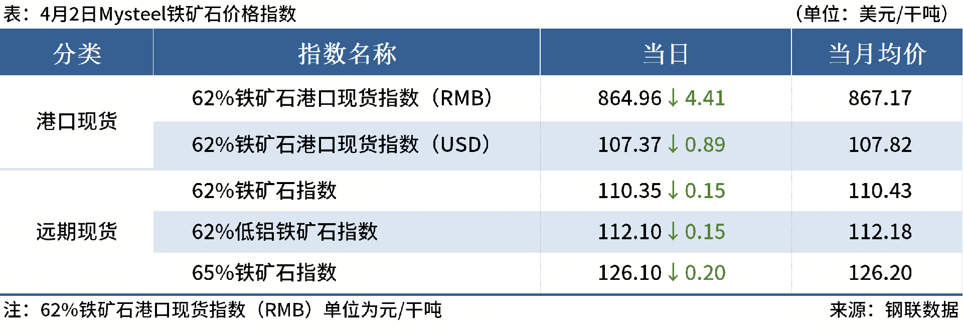 ◎4月2日,全國(guó)主港鐵礦石成交102.10萬噸,環(huán)比減0.3%;237家主流貿(mào)易商建筑鋼材成交9.62萬噸,環(huán)比減9.5%。